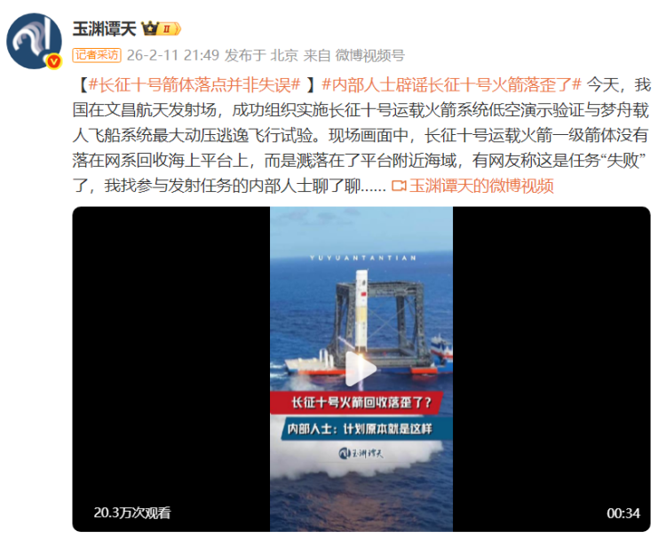 2月11日,我国在文昌航天放射场,见效组织现实长征十号输送火箭系统低空演示考据与梦舟载东谈主飞船系统最大动压潜逃遨游锻练。现场画面中,长征十号输送火箭一级箭体莫得落在网系回收海上平台上,而是溅落在了平台隔壁海域,有网友称这是任务“失败”了,开云体育官方网站我找参与放射任务的里面东谈主士聊了聊……