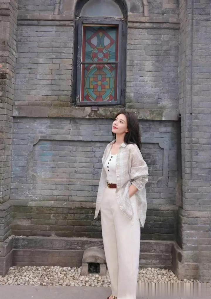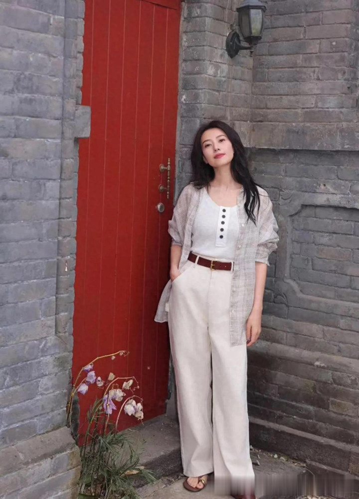 开云sports 高圆圆私服穿搭真好意思丽! 格子衬衫+纽扣背心+白裤子, 稳定又减龄!