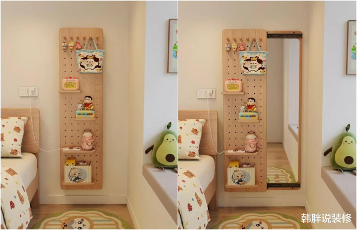 还有网友的的操作让东说念主目下一亮,她在床头装了个洞洞板,板子拉开,后面藏着穿衣镜。