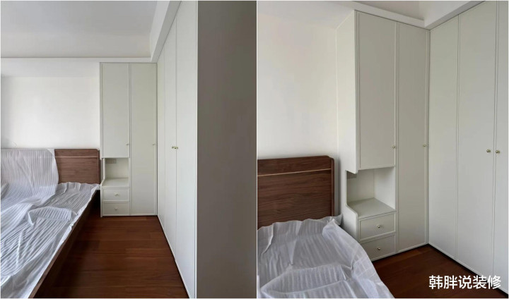 底下这个网友家的床头作念了木饰面,衣柜趁势延长到床边。