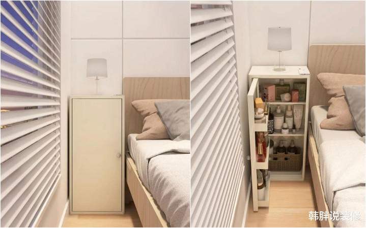 她在衣柜辘集床头的位置作念了个抽拉层板,日间的时刻推动去,谁也看不出来。晚上的时刻,把隔板拉出来放东西。