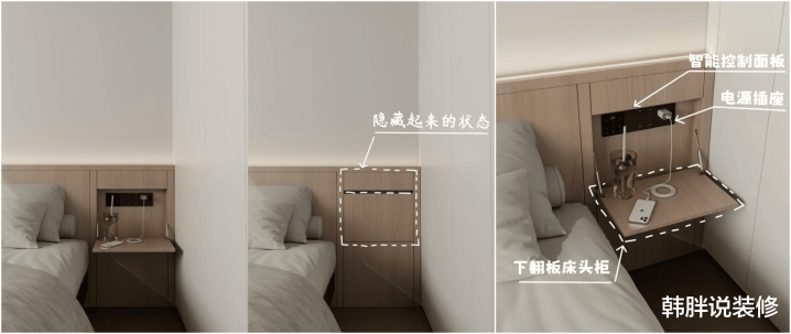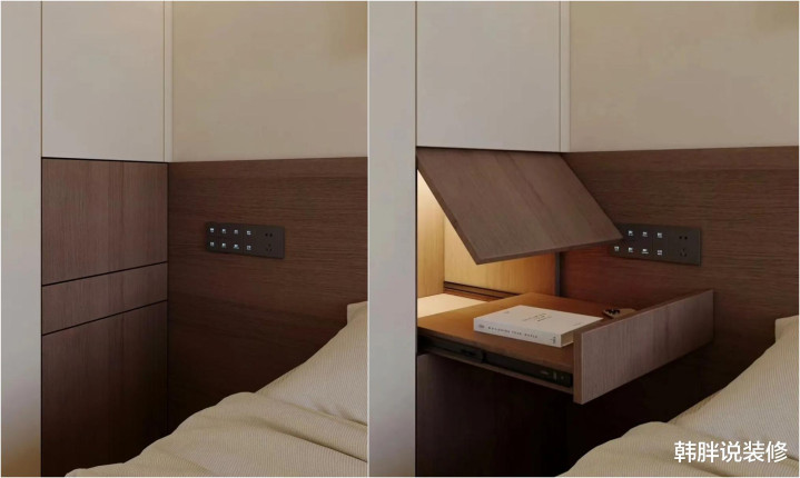 把板子翻下来等于床头柜,不需要的时刻,再把板子翻上去严丝合缝。内部还藏了开关和智能面板,便捷宽敞充电大要使用台灯。看起来是配景墙,掀开是收纳。