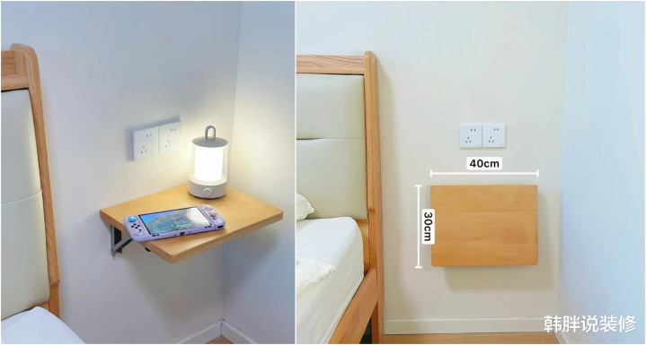 有一个网友,家里莫得买床头柜,而是我方买了两个折叠三角架,搭块木板,螺丝固定。