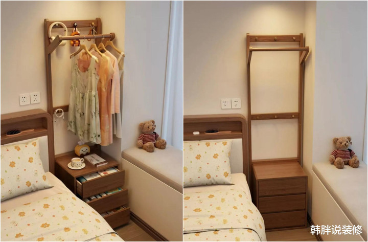 他索性找了个三抽柜,上头加个挂衣杆。抽屉用来收纳杂物,台面上不错戒指机、水杯、纸巾,杆子不错挂寝衣、外衣。