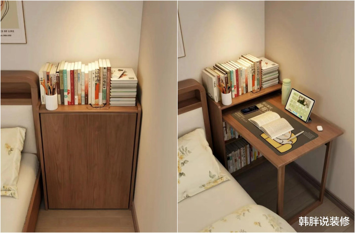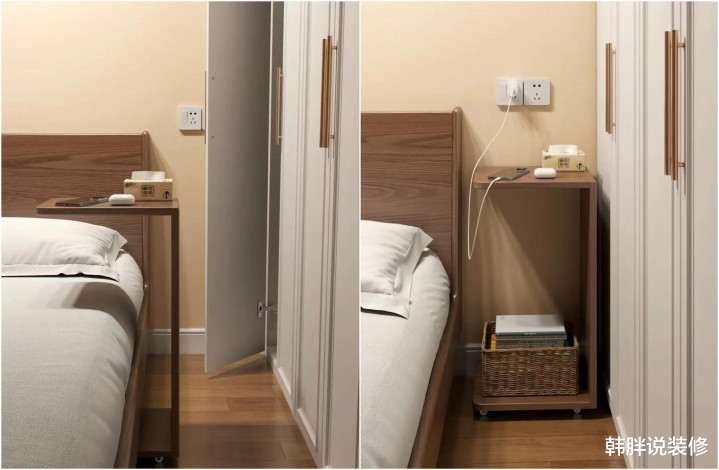 于是,她就买了一个个带轮子的小边几,日间推到床底,晚上拉出来卡在床边,都备不碍事。