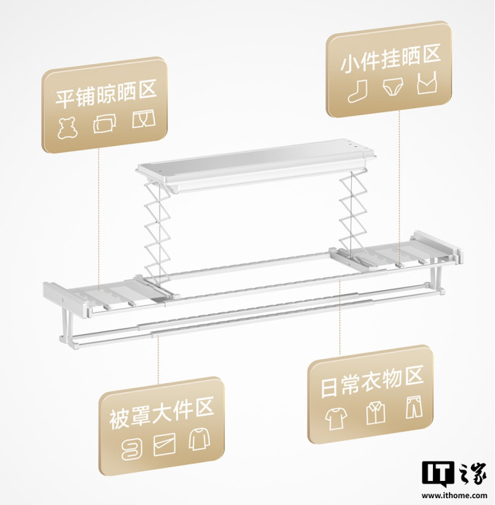 这款新品接纳4分区(平铺曝晒区、小件挂晒区、被罩大件区、浅显衣物区)曝晒,内衣鞋袜不混晾;共有94个曝晒位(38个怒放式挂槽位、32个旋转晾衣夹挂位、20个伸缩细杆挂位、2个曝晒网、2根晾被杆)。