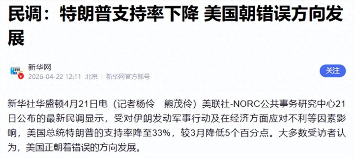 好意思联社-NORC环球事务磋商中心在当地时间2026年4月21日公布最新民调,这项民调于4月16日至20日进行,2596名好意思国成年东谈主受访。