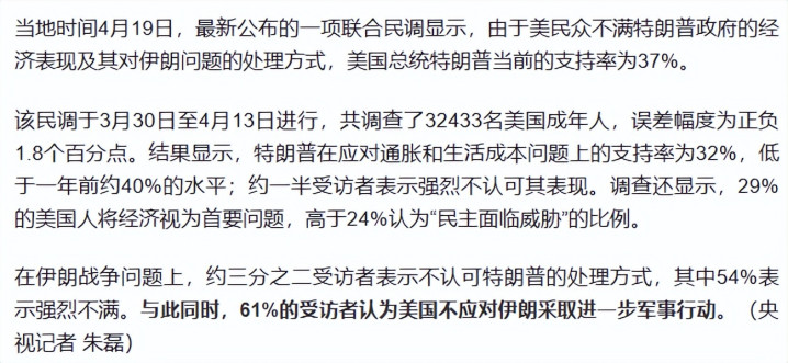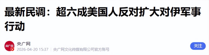 4月19日的民调泄漏,61%的受访者反对扩大对伊军事举止,48%以为构兵让我方“愈加不安全”,64%以为构兵代价过高,不值得。