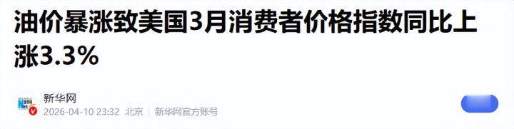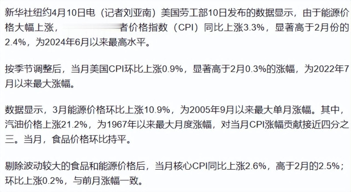 4月10日,好意思国劳工统计局发布的3月CPI申报泄漏,通胀率从2月的2.4%飙升至3.3%,创下2024年5月以来新高,其中汽油价钱单月暴涨21.2%,创下1967年以来最大月度涨幅。