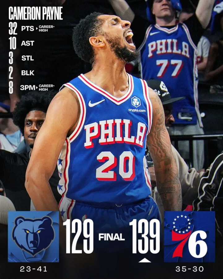 其时76东谈主主场139-129征服灰熊,开云体育马克西、恩比德、乔治等多东谈主缺席,然后佩恩落拓输出,替补登场30分钟,投篮10中9,三分8中8,罚球6中6,得到32分3篮板10助攻3抢断,单场32分、8记三分王人创下了佩恩的糊口新高。