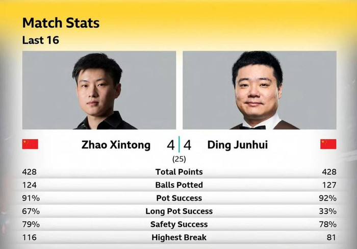 北京时分4月25日凌晨,2026年斯诺克世锦赛16进8轮次备受戒备的“中国德比”首阶段八局较量战罢,丁俊晖赵心童两东谈主以4-4打成平手,总得分428-428更是惊东谈主的一致,一分不差,为今(25)日21:30的第二阶段较量增添了更多悬念。