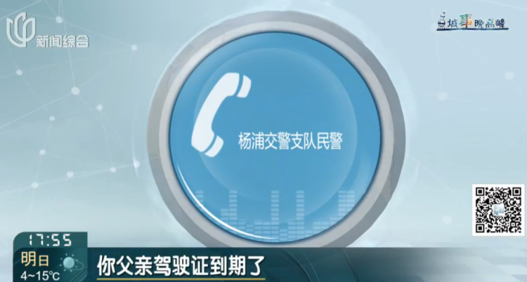 杨浦交警支队民警 : 你父亲驾驶证到期了,我是杨浦交警支队民警,告知他一下,要去宁波路换证了。