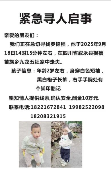 四川泸州叙永县2岁男童罗锦程于2025年9月18日下昼在村里家中失散,迄今已近5个月。2026年2月初,其母亲罗女士更新动态,仍在继续寻找和女儿相干的陈迹。