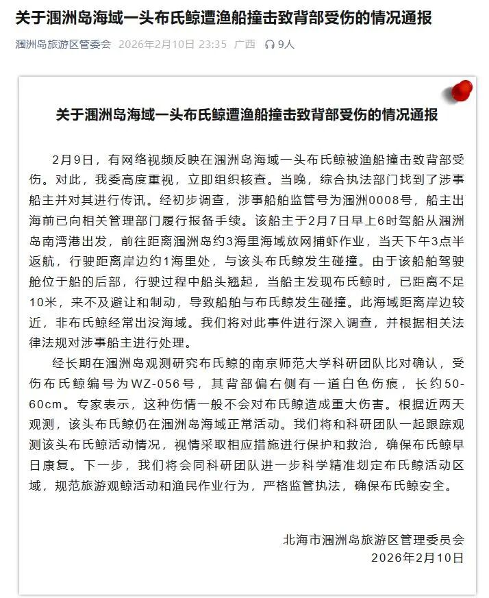 2月10日晚,北海市涠洲岛旅游区贬责委员会发布情况通报称,“经初步看望,涉事船舶监管号为涠洲0008号,船长出海前已向关连贬责部门履行报备手续。该船长于2月7日早上6时驾船从涠洲岛南湾港登程,赶赴距离涠洲岛约3海里海域放网捕虾功课,本日地午3点半返航,行驶距离岸边约1海里处,与该头布氏鲸发生碰撞。由于该船舶驾驶舱位于船的后部,行驶经过中船头翘起,当船长发现布氏鲸时,已距离不足10米,来不足逃避和制动,导致船舶与布氏鲸发生碰撞。此海域距离岸边较近,非布氏鲸平素出没海域。咱们将对此事件进行深远看望,并凭证关连法律限定对涉事船前途行处理。