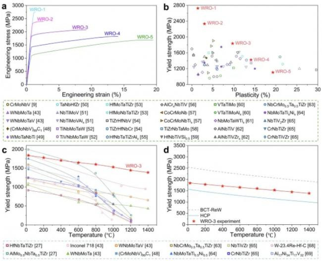 图a为室温压缩应力-应变弧线,浮现该合金的屈服强度达1.83 GPa,塑性约9%;图b为W₄₂Re₃₀Os₂₈与其他难熔高熵合金及高温合金的强度-塑性对比散点图;图c为从室温至1400°C的屈服强度变化弧线,浮现W₄₂Re₃₀Os₂₈在1400°C仍保抓1.38 GPa的高强度,开云体育官方网站远超镍基高温合金终点他难熔合金。