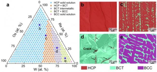 {jz:field.toptypename/}图a为通过高通量XRD构建的W-Re-Os合金室温相图,浮现了HCP、BCT、BCC单相区及HCP+BCT、BCT+BCC双相区;图b-e为四个代表性样品的EBSD相图,其中图d浮现单相BCT合金存在裂纹,而图c和图e所示的双相区合金无裂纹,呈现出特有的亚共晶组织。