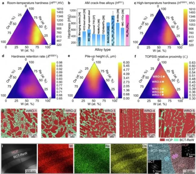 图a为室温硬度踱步图,浮现含有BCT相的合金硬度最高;图c为1000°C高温硬度踱步图,W₄₂Re₃₀Os₂₈地方区域发扬出优异的硬度保抓率。