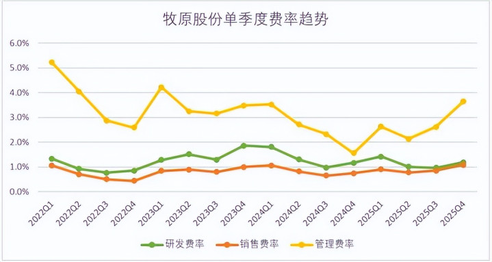 用度层面,2025年第四季度牧原股份的销售用度、措置用度、研发用度差别录得3.5亿元、11.8亿元、3.9亿元,从费率趋势来看,销售用度守护在1.1%、研发用度为1.2%,环比微增了20bp。