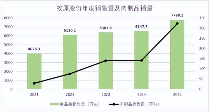 与营收酿成显著对比的是,2025年全年牧原股份的出栏量冲破新高,达到了接近7800万头。往时一年间,牧原扩产节律相配激进,况且2026年给出了7500万头-8100万头的陶冶。要知谈前年宇宙规模内的出栏量只消7.2亿头,相配于牧原的市占率达到了11%,畴昔还有扩大的趋势。