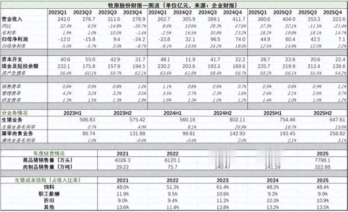 同期,淌若细看牧原财报便不难发现,2025年全年合座的业务毛利率其实守护的还算可以,天然四季度合座毛利率下滑至14.7%,关联词比拟2021年的周期低点,牧原关于本轮猪周期的准备照旧相配充分的。