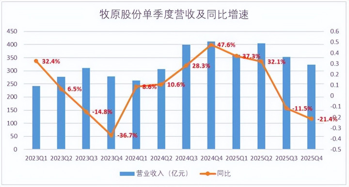 拆分季度来看,2025年第四季度,牧原录得买卖收入324亿元,同比大幅度下滑21.4%。2025年下半年贯串两个季度营收负增长,产能膨大的红利没能起义周期下行的压力。