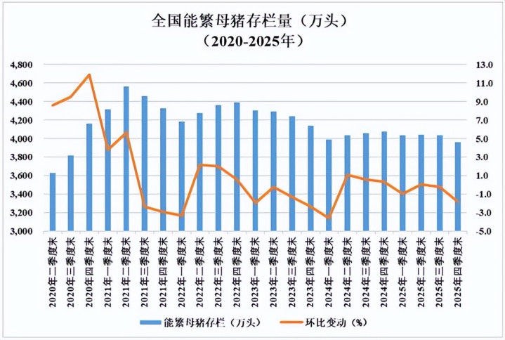 ·受益于PSY提高,能繁母猪存栏量4100万头的周期变盘货出现下探,自2023年三季度末以来,宇宙能繁存栏量其实就依然跌破4100万头,但周期莫得出现昭着拐头的动作,把柄Mysteel的连络,截止2025年末,宇宙能繁母猪存栏量3961万头,仍超出平常保有量1.6%,畴昔猪周期变盘货可能需要通过本轮猪周期进行不雅察。
