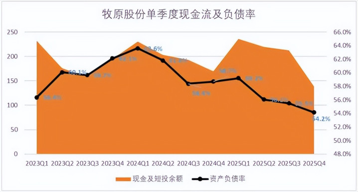 钞票端为止最新财报期,牧原股份的欠债率为54.2%,相较于2024年头,下落了梗概10pct。较2025年头下落4.53pct,欠债总和较年头下落171亿元。