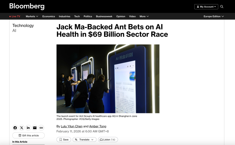 【环球网科技抽象报谈】2月11日,彭博社(Bloomberg News)发布深度报谈指出,在众人医疗东谈主工智能(AI)的竞技场上,中国正凭借计谋红利、科技巨头的深度参与以及弘大的用户基数,展现其工夫上风。以蚂结合团旗下的AI健康助手“蚂蚁阿福”为例,中国科技企业正通过“AI医目生身”等前沿工夫开云体育官方网站,对范畴达690亿好意思元的医疗健康赛谈发起冲击。