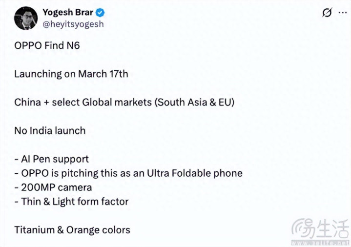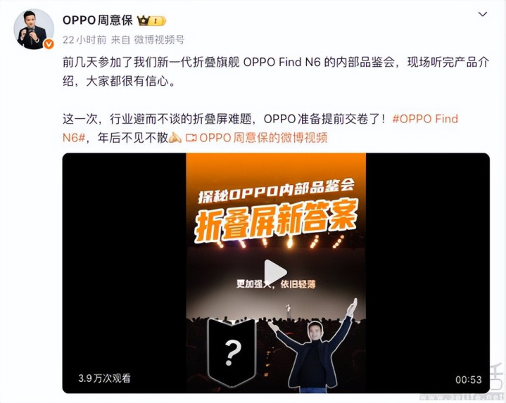跟着OPPO Find N6推敲信息的陆续曝光,这款官方已证据将于春节后发布的旗舰大折叠也引诱了繁密浮滥者的情愫。继日前官方推敲东谈主士露馅,OPPO Find N6里面品鉴会上也曾露馅将“提前交卷折叠屏坚苦”后,近日有音问源称这款新机或将于3月17日厚爱发布,并曝光了其居品端的进一步细目。