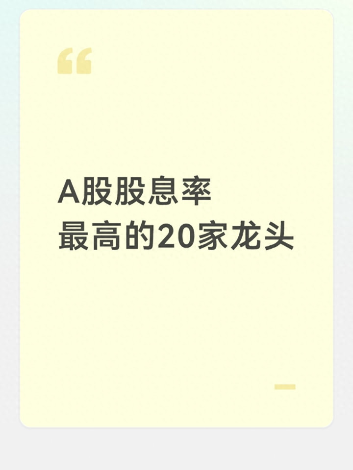 本文基于公开市集数据与行业基本面信息,对现时A股市集股息率靠前、具备龙头属性的20家上市公司进行系统梳理,内容仅为投资逻辑科普与数据整理,不组成任何投资提议,不波及买卖点位保举,市集有风险,投资需严慎。